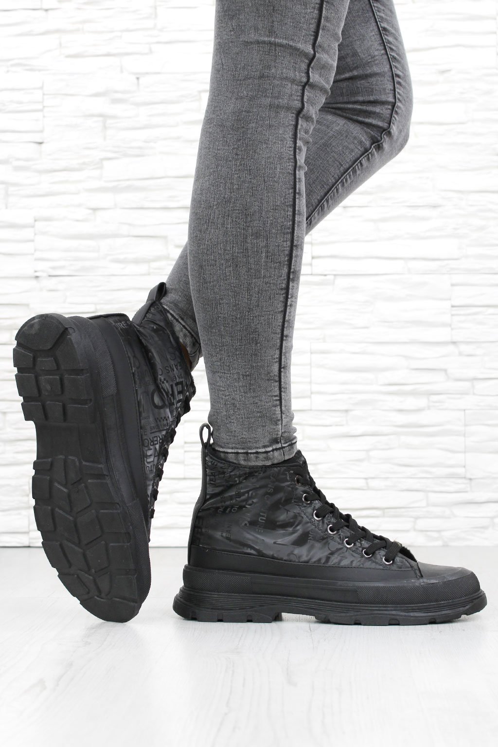 Nápisy ve stejné černé barvě, kterými jsou tyto kotníkové tenisky zdobeny, přidávají do designu nápadný prvek a umocňují moderní charakter obuvi.
