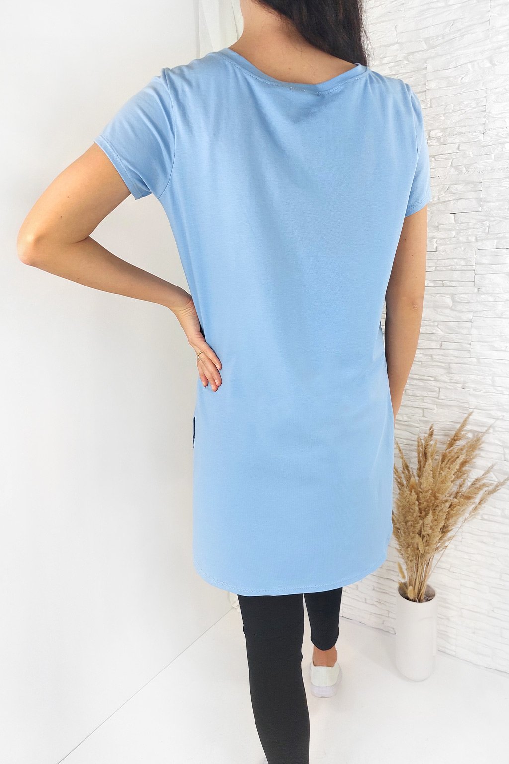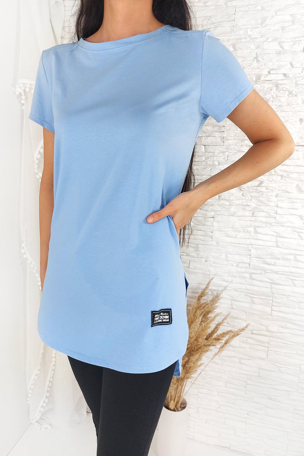 Dámské basic bavlněné triko které je vzadu delší, vpředu kratší. Po bocích má větší rozparek. Příjemný materiál, neprůsvitný. Velikost trika je univerzální a je vhodné pro dámy s velikostí XS až L. Naše modelka je vysoká 170 cm a nosí velikost XS-S.