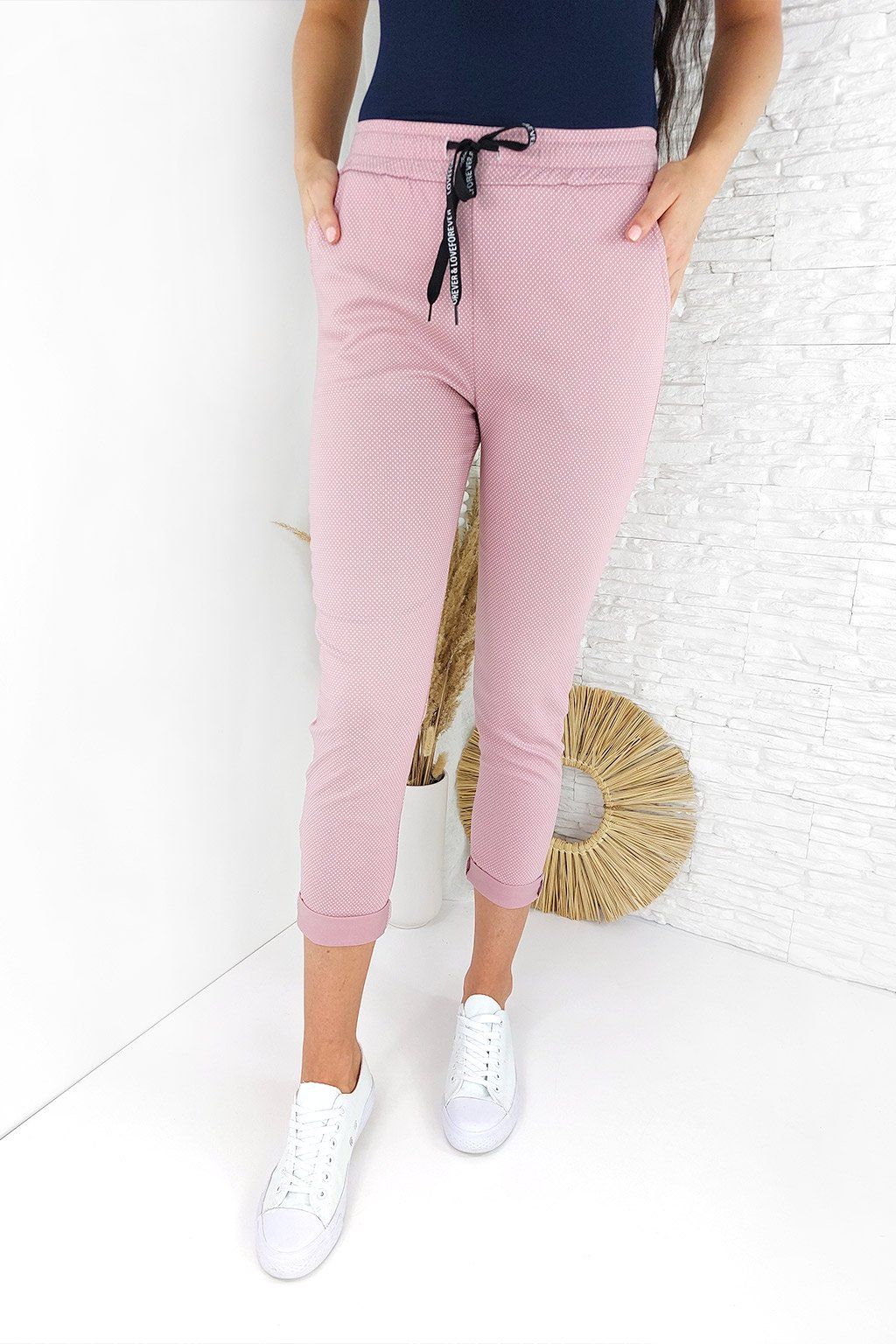 Tyto puntíkaté kalhoty jsou univerzální velikosti a doporučujeme je pro ženy do velikosti M. Jsou ušity z velice příjemného, pevnějšího materiálu, který ovšem není průsvitný. V pase jsou na gumu a tkaničku, kterou si utáhnete dle své potřeby. Naše modelka je vysoká 170 cm a běžně nosí velikosti XS-S.