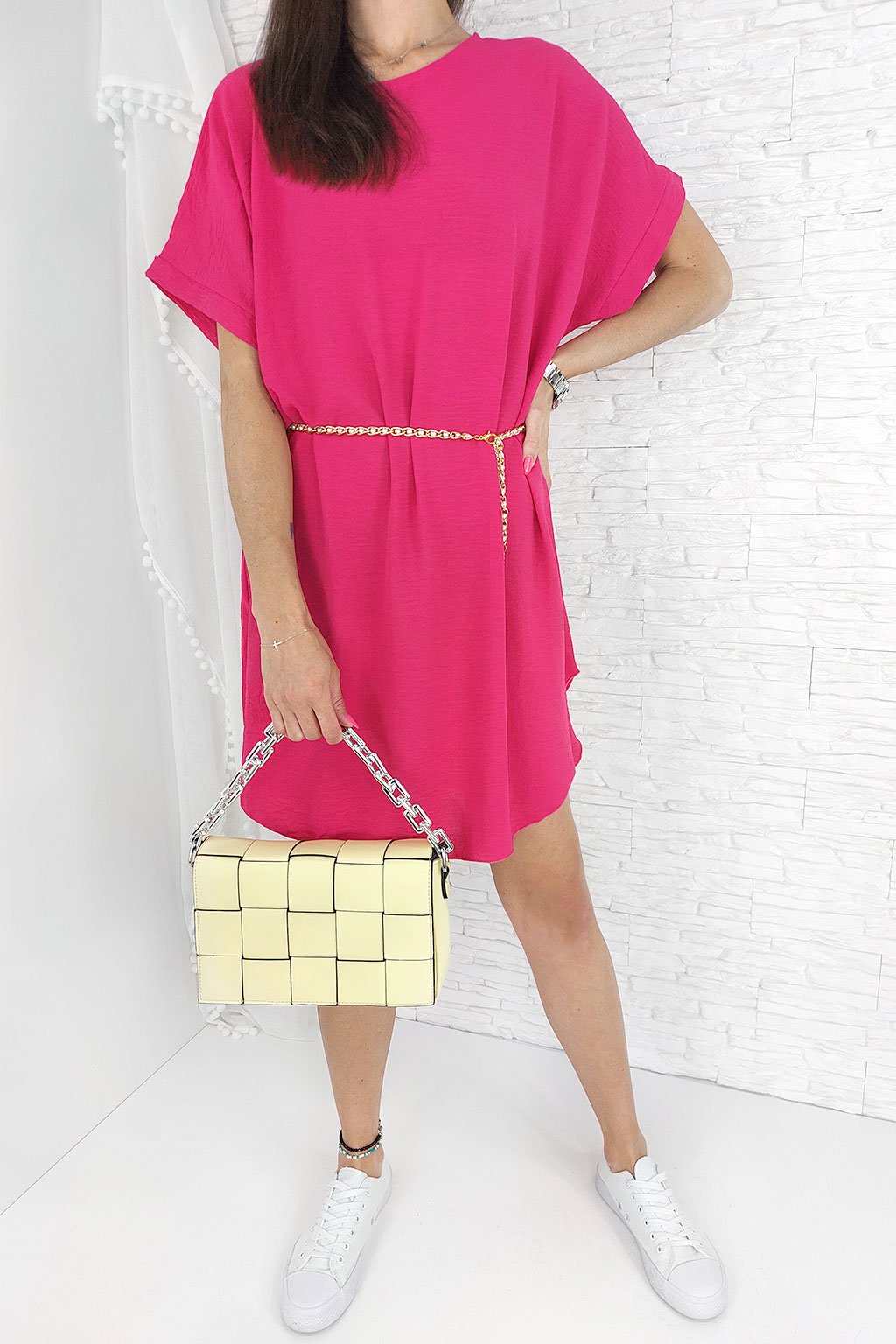 Dámské šaty s perličkovým zlatým páskem. Skvělý kousek do horkých letních dní či na dovolenou k moři. Šaty jsou kratší, lze je využít i jako tuniku například s legíny. Jsou jednoduchého, volného střihu. Pásek je součástí a obdržíte ho spolu s šaty. Velikost je psaná univerzální ale doporučujeme je do velikosti XL v případě tuniky. Naše modelka je vysoká 170 cm a běžně nosí velikost XS-S.